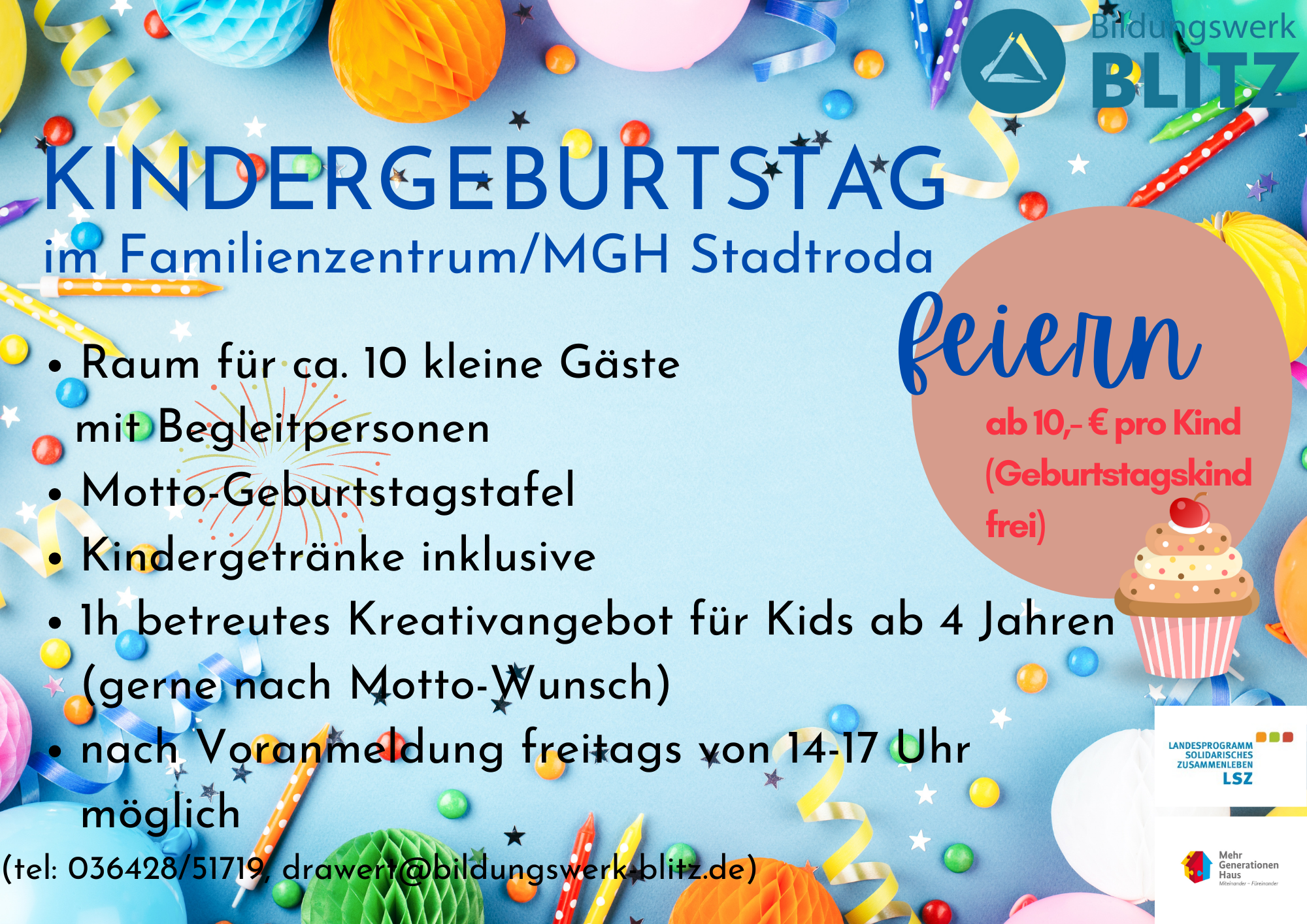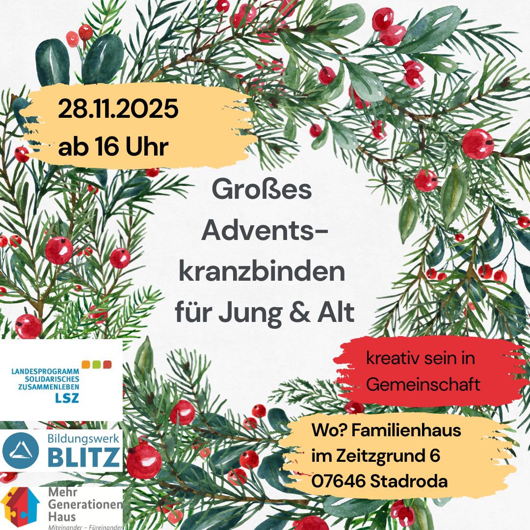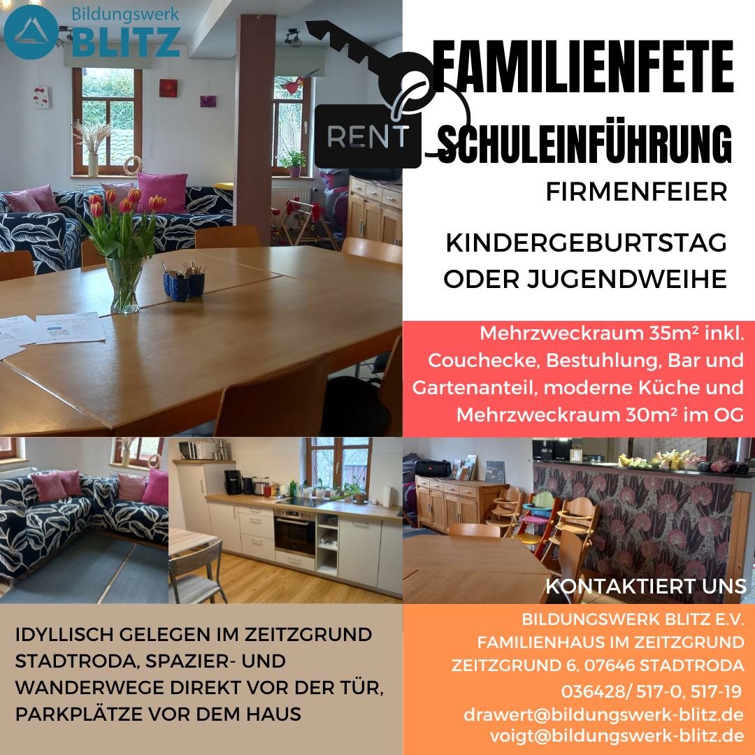 Seit Herbst 2021 beherbergt Bildungswerk BLITZ e.V. zwei wunderbare Projekte für Menschen von 0-99 Jahren im Zeitzgrund 6 in Stadtroda. Das seit nunmehr 13 Jahren erfolgreich bestehende Mehrgenerationenhaus und das neu entstandene Familienzentrum. Ermöglicht wurde dies durch Mittel aus dem Landesprogramm für solidarisches Zusammenleben der Generationen (LSZ). Damit konnten zusätzliche Personalstellen geschaffen werden um neue Angebote für Kinder, Jugendliche und die ganze Familie zu schaffen.